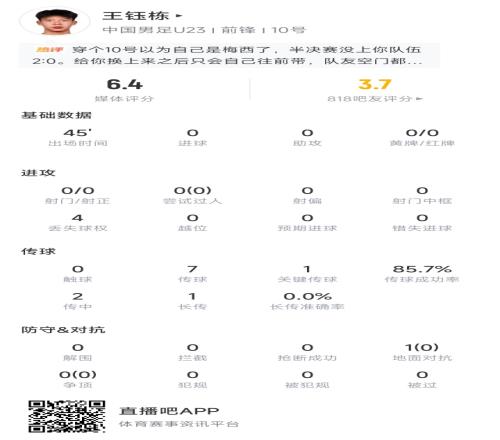 体育播报01月24日宣 U23亚洲杯决赛,中国男足U23vs日本U23,上半场比赛U23国足0-2落后日本U23,王钰栋上半场比赛完成13次触球,7次传球成功率85.7%,4次丢失球权。